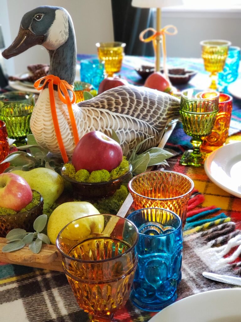 Instead of splurging on flowers for the centerpiece, I placed the Canada goose in the center of a long wooden Hearth & Hand tray I picked up from Target years ago. I filled the tray with vintage amber (Indiana glass) candle holders, reindeer moss, and fresh apples…all of which made the centerpiece feel right at home on a vintage Thanksgiving tablescape.